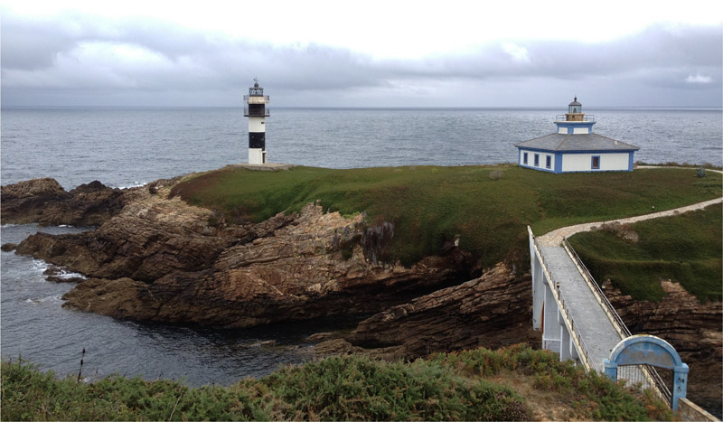 La primera parada, el faro de Illa Pancha y sus acantilados. Este faro, situado en la isla, se construyó en el siglo XIX y empezó a funcionar en 1.859, dejando de hacerlo en 1.984, sustituido por la torre que se construyo a su lado. Me gusta este sitio por lo fotogénico que es. El negro y blanco del faro destaca entre la multitud de colores que le da el mar, el cielo, las nubes, así como las plantas y flores del entorno. Los días de mar fuerte es un verdadero espectáculo ver saltar las olas por entre las rocas, llegando en ocasiones al mismo faro.