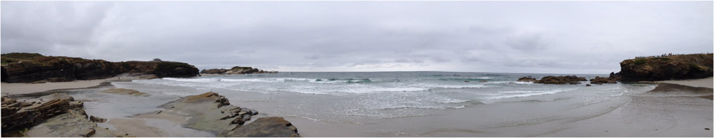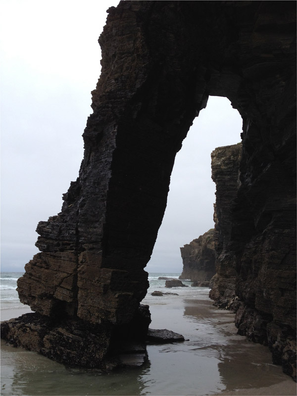 Acabada la comida, nuestro objetivo la hiperconocida y turística Playa de las Catedrales, o Praia As Catedrais, en gallego. La marea baja es a las tres, pero no llegamos antes de las cuatro. Aunque ya estaba subiendo, podemos pasear por ella en su totalidad. Disfrutamos de sus arcos y pórticos naturales, que le dan nombre, de sus cuevas y de sus impresionantes acantilados. Aunque hay gente, no tanta como en otras ocasiones y el día está oscuro, podemos hacer algunas fotos interesantes.