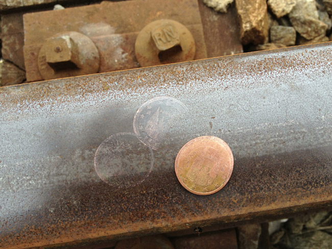 Y no solo eso, sino que recordando momentos de mi juventud en la estación de Ciempozuelos en Madrid, hemos puesto unas monedas de 2 y 5 céntimos en la vía a la ida y las hemos recogido aplastadas a nuestra vuelta para guardarlas de recuerdo. Por supuesto que de esto no hemos hablado con el revisor 😉