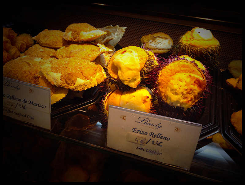 Tras pasear por la calle Alcalá, La Puerta del Sol, Arenal, la Plaza de la Villa y la Plaza Mayor nuestra primera parada es el Mercado de San Miguel. Ya solo visitar el edificio y su entorno merece la pena, pero lo mejor nos espera dentro. El concepto es el de tapear de toda la vida, pero sin movernos del lugar. Pides una bebida (o varias) y la idea es ir de puesto en puesto tomando las tapas que más te llamen la atención, o simplemente que más te gusten. La variedad de tapas es grande, desde las tradicionales de toda la vida, a las regionales, a las multinacionales, fusión, etc y todo desde 1 euro en adelante por tapa. En nuestra visita de hoy, vermut y sangría (¡no se cuánto hace que no me tomaba un vermut!), acompañado de tapas de gulas al ajillo, queso de cabra con cebolla caramelizada, foie con cebolla caramelizada y mermelada de frambuesas, anchoas, pulpo, salmón con salsa de eneldo, gamba cubierta de patata y erizo.